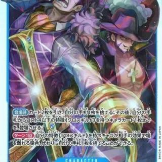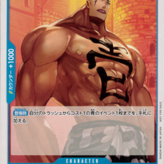 テキスト:自分の元々のコスト5以上のキャラが2枚以上いる場合、このキャラは【ブロッカー】を得て、コスト+1。(相手のアタックの後、このカードをレストにし、アタックの対象をこのカードにできる)【KO時】自分のリーダーが「バギー」で、自分の手札が3枚以下の場合、カード1枚を引く。