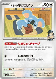 種類:たねポケモン HP:90 特性:むきりょくチャージ このポケモンがベンチにいるなら、自分の番に1回使える。自分の手札からエネルギーを1枚選び、バトル場の「アオキのポケモン」につける。 ワザ1:いねむりドロー 無 このポケモンをねむりにする。自分の山札を2枚引く。 にげるコスト:-無無 弱点:闘×2 抵抗力:なし イラスト:ryoma uratsuka シリーズ:スタートデッキ100 バトルコレクション コレクションナンバー:619/742 レギュレーション:J