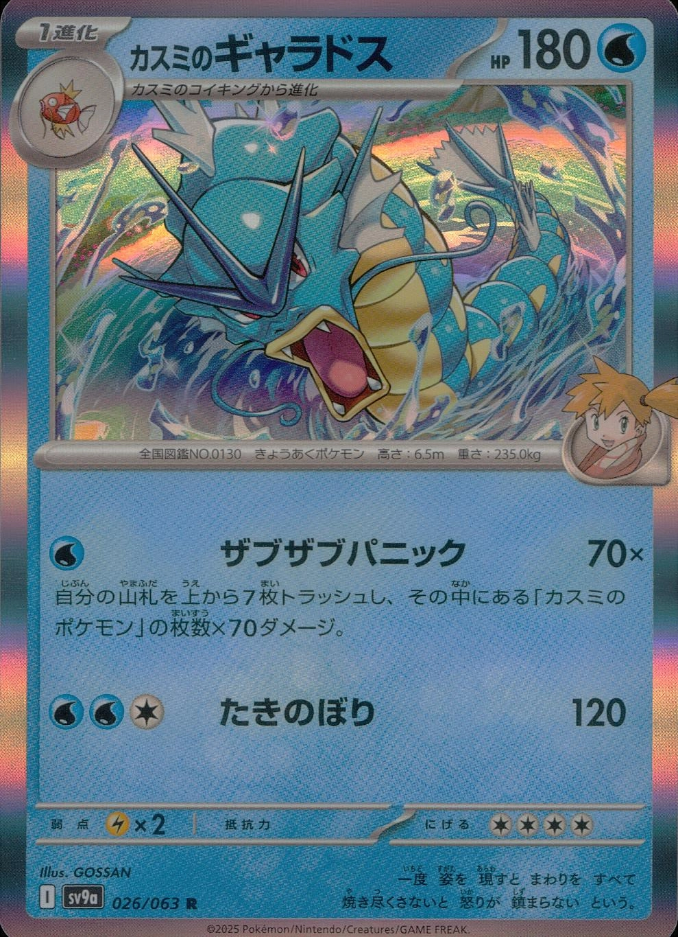ワザ1:ザブザブパニック 水 70× 自分の山札を上から7枚トラッシュし、その中にある「カスミのポケモン」の枚数×70ダメージ。