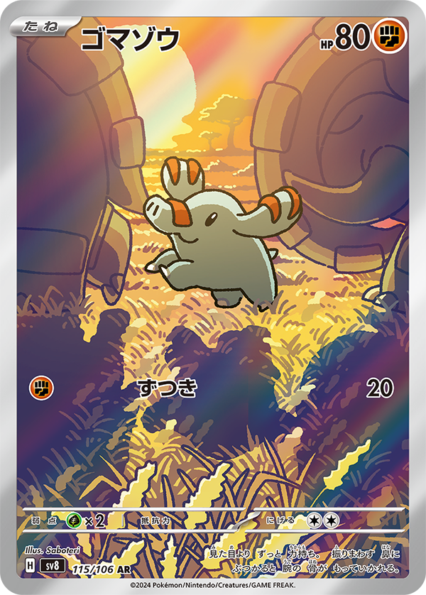 種類:たねポケモン HP:80 ワザ1:ずつき 闘 20 にげるコスト:-無無 弱点:草×2 抵抗力:なし イラスト:ryoma uratsuka Saboteri レギュレーション:H