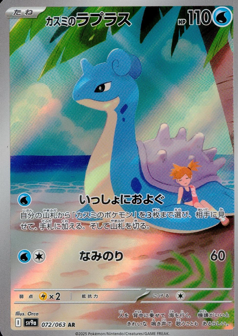 ワザ1:いっしょにおよぐ 水 自分の山札から「カスミのポケモン」を3枚まで選び、相手に見せて、手札に加える。そして山札を切る。