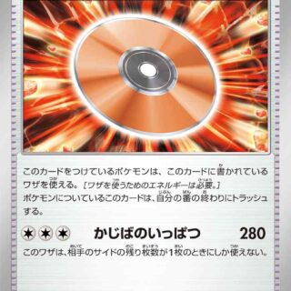 説明文:このカードをつけているポケモンが受ける、相手のワザのダメージは、「-20」される。このカードは、このカードをつけた番の、次の相手の番の終わりにトラッシュ。ポケモンのどうぐは、自分のポケモンにつけて使う。すでにポケモンのどうぐをつけているポケモンには、つけられない。