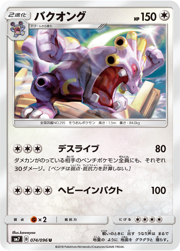 ワザ1:サドンシャウト 無 相手のバトルポケモンと、ついているすべてのカードを、トラッシュする。この番、このポケモンが「ドゴーム」から進化していないなら、このワザは失敗。