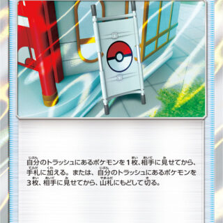 説明文:おたがいのバトルポケモン全員のワザは、すべて失敗する。(失敗しても、ワザを使ったことになる。)どちらかのバトルポケモンがワザを使った番の終わりに、このカードをトラッシュする。スタジアムは、自分の番に1回だけ、バトル場の横に出すことができる。別の名前のスタジアムが場に出たなら、このカードをトラッシュする。