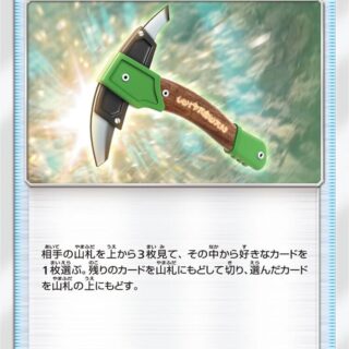 説明文:自分の番の終わりに、このカードをつけているポケモンがバトル場にいるなら、自分の山札からカードを1枚引く。ポケモンのどうぐは、自分のポケモンにつけて使う。すでにポケモンのどうぐをつけているポケモンには、つけられない。
