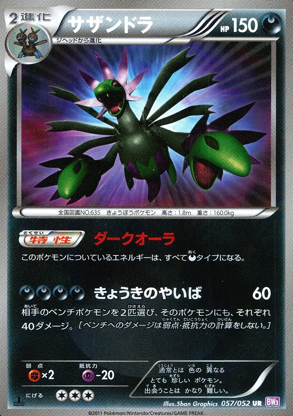 特性:トライハウル 自分の番に1回使える。自分の山札を上から3枚見て、その中からエネルギーを好きなだけ選び、自分のポケモンに好きなようにつける。残りのカードはトラッシュする。