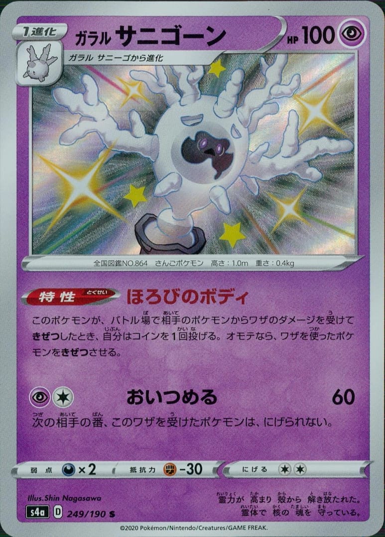 ワザ1:おしつけさいせい 超 相手のトラッシュからたねポケモンの「ポケモンV」を1枚選び、相手のベンチに出す。その後、そのポケモンの残りHPが「30」になるように、ダメカンをのせる。