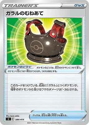 種類:ポケモンのどうぐ 説明文:このカードをつけている、名前に「ガラル」とつくポケモンが、相手のポケモンから受けるワザのダメージは「-30」される。 イラスト:inose yukie レギュレーション:E