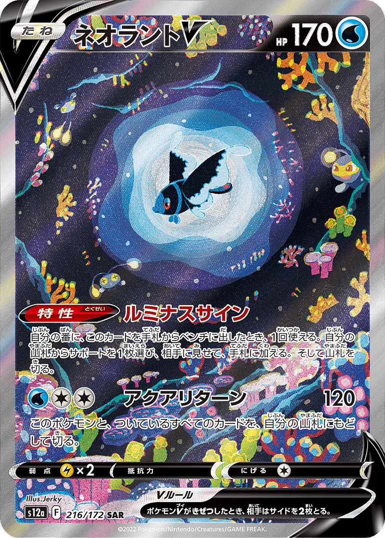 特性:ルミナスサイン 自分の番に、このカードを手札からベンチに出したとき、1回使える。自分の山札からサポートを1枚選び、相手に見せて、手札に加える。そして山札を切る。