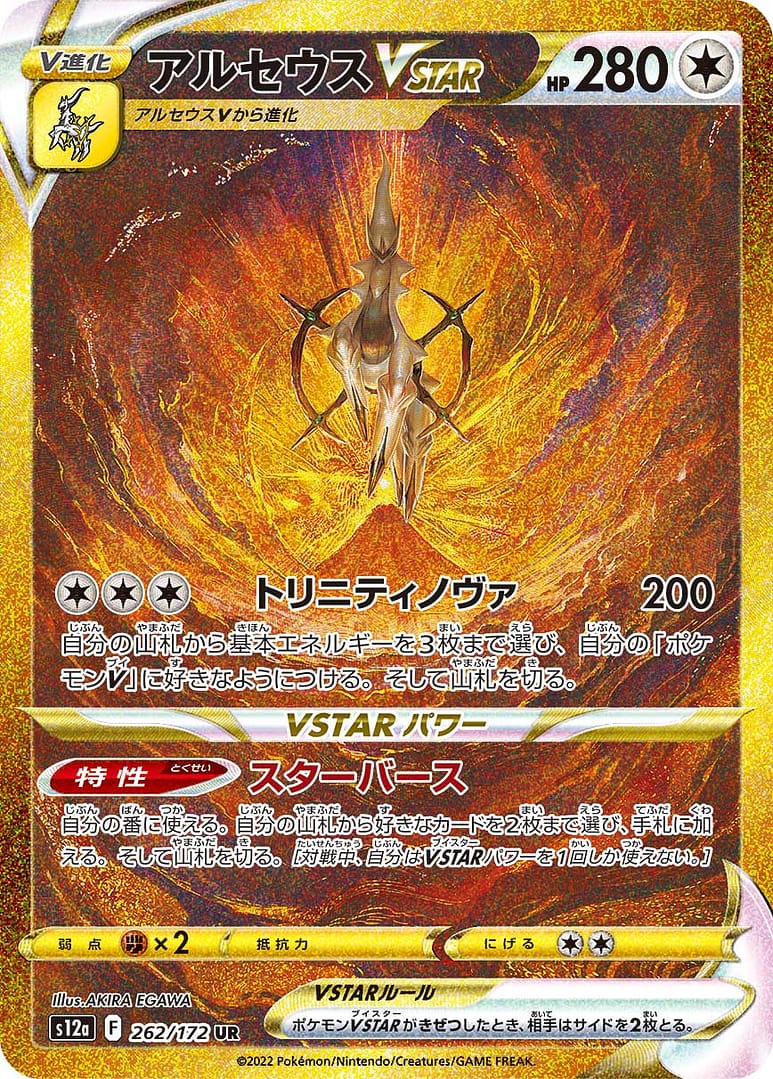 特性:スターバース 自分の番に使える。自分の山札から好きなカードを2枚まで選び、手札に加える。そして山札を切る。[対戦中、自分はVSTARパワーを1回しか使えない。]