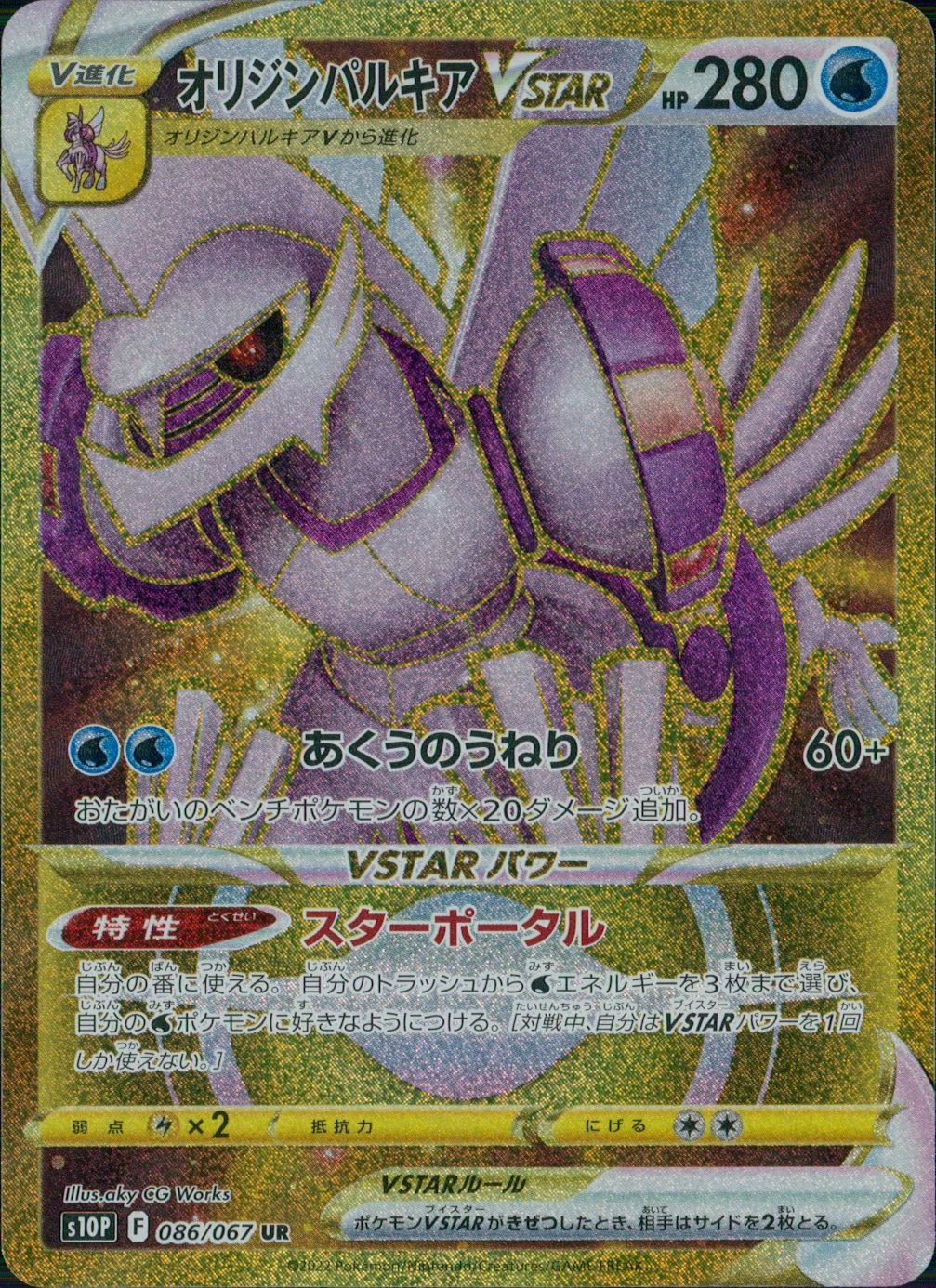 特性:スターポータル 自分の番に使える。自分のトラッシュから[水]エネルギーを3枚まで選び、自分の[水]ポケモンに好きなようにつける。[対戦中、自分はVSTARパワーを1回しか使えない。]