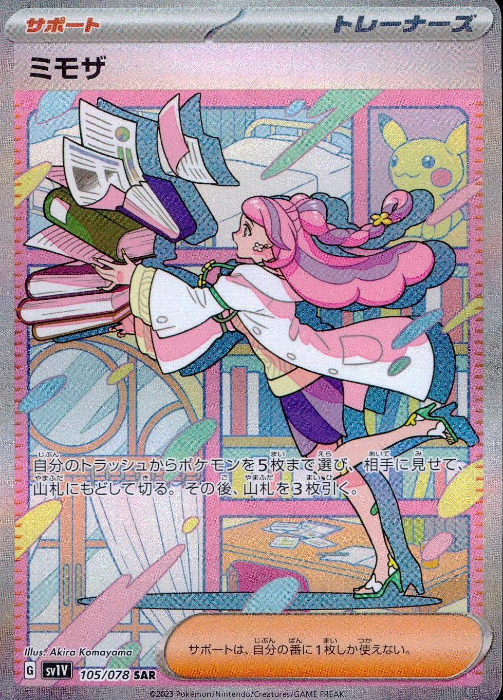 説明文:自分のトラッシュからポケモンを5枚まで選び、相手に見せて、山札にもどして切る。その後、山札を3枚引く。