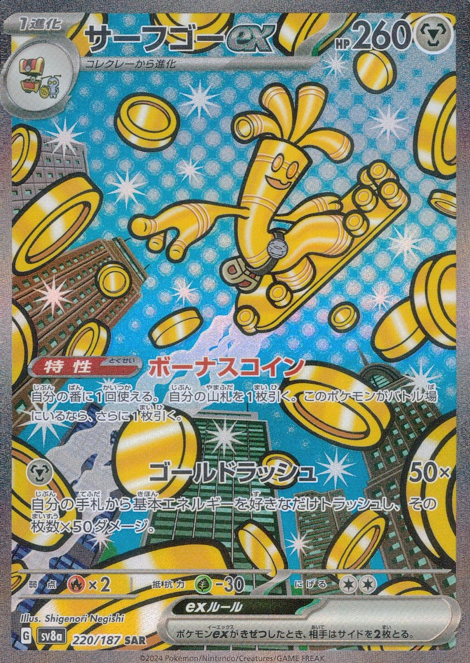 特性:ボーナスコイン 自分の番に1回使える。自分の山札を1枚引く。このポケモンがバトル場にいるなら、さらに1枚引く。