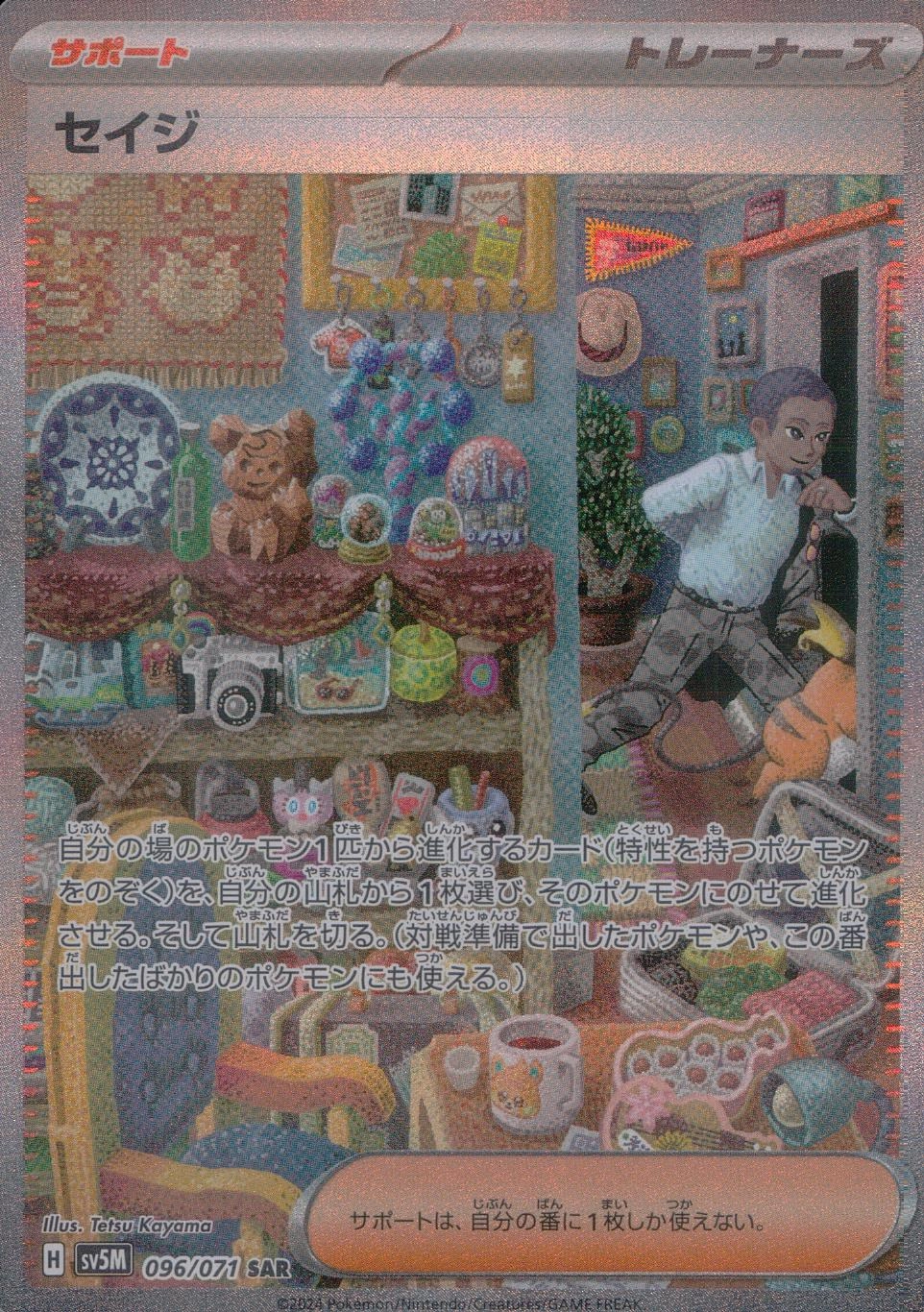 説明文:自分の場のポケモン1匹から進化するカード(特性を持つポケモンをのぞく)を、自分の山札から1枚選び、そのポケモンにのせて進化させる。そして山札を切る。(対戦準備で出したポケモンや、この番出したばかりのポケモンにも使える。)