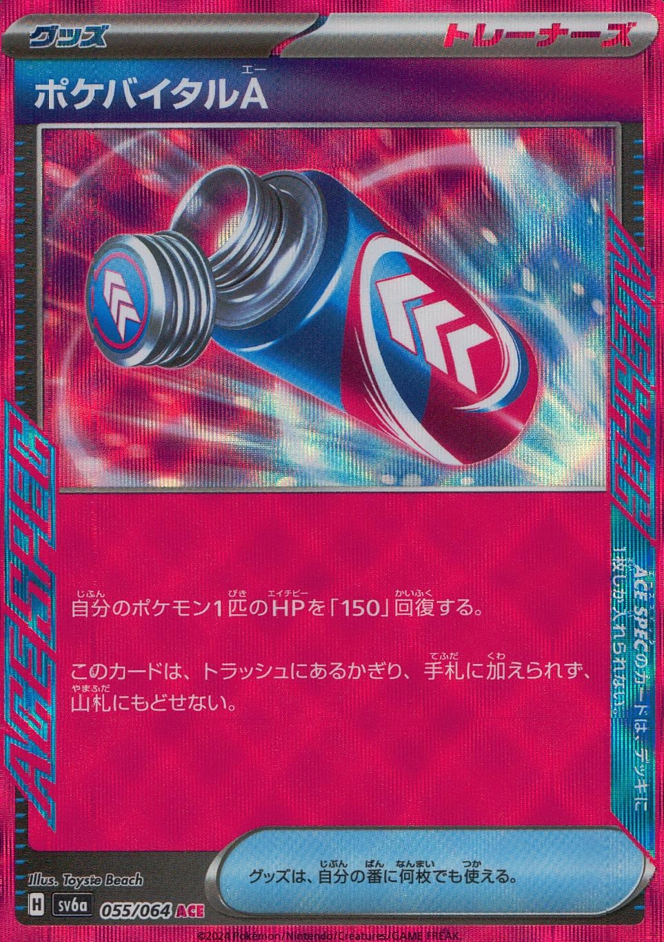 説明文:自分のポケモン1匹のHPを「150」回復する。このカードは、トラッシュにあるかぎり、手札に加えられず、山札にもどせない。