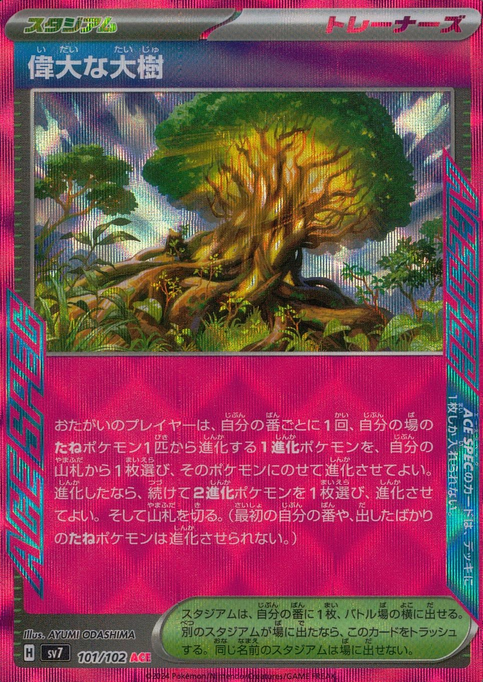 説明文:おたがいのプレイヤーは、自分の番ごとに1回、自分の場のたねポケモン1匹から進化する1進化ポケモンを、自分の山札から1枚選び、そのポケモンにのせて進化させてよい。進化したなら、続けて2進化ポケモンを1枚選び、進化させてよい。そして山札を切る。(最初の自分の番や、出したばかりのたねポケモンは進化させられない。)