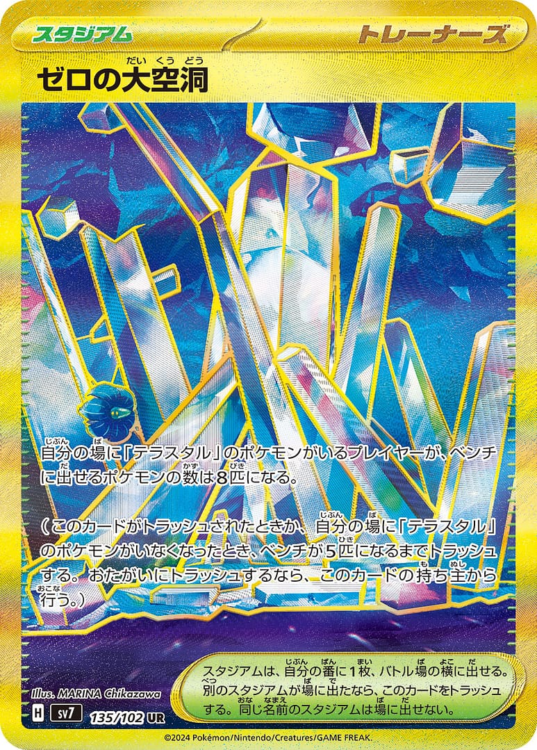 説明文:自分の場に「テラスタル」のポケモンがいるプレイヤーが、ベンチに出せるポケモンの数は8匹になる。(このカードがトラッシュされたときか、自分の場に「テラスタル」のポケモンがいなくなったとき、ベンチが5匹になるまでトラッシュする。おたがいにトラッシュするなら、このカードの持ち主から行う。)