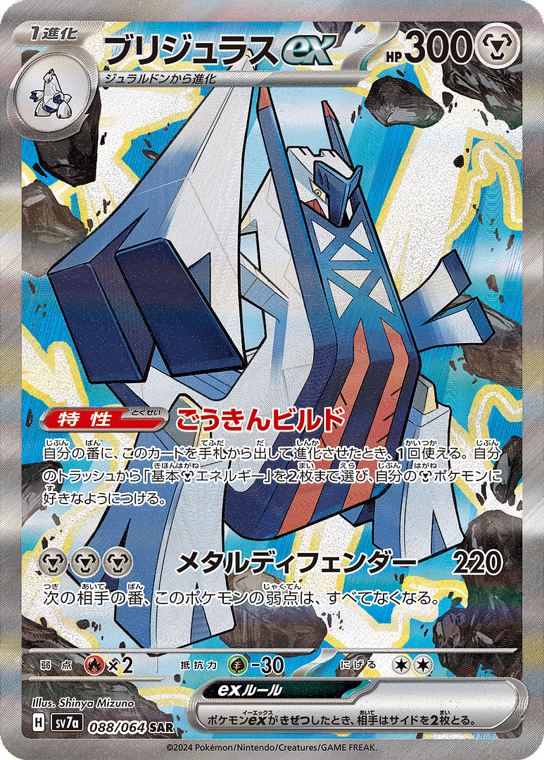 特性:ごうきんビルド 自分の番に、このカードを手札から出して進化させたとき、1回使える。自分のトラッシュから「基本[鋼]エネルギー」を2枚まで選び、自分の[鋼]ポケモンに好きなようにつける。