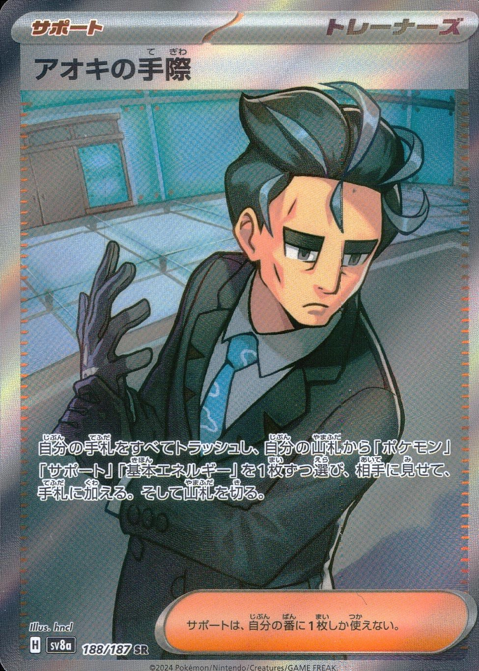 説明文:自分の手札をすべてトラッシュし、自分の山札から「ポケモン」「サポート」「基本エネルギー」を1枚ずつ選び、相手に見せて、手札に加える。そして山札を切る。