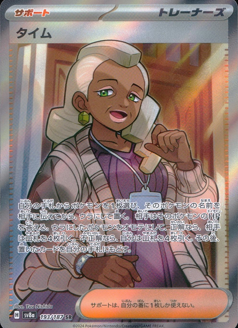 説明文:自分の手札からポケモンを1匹選び、そのポケモンの名前を相手に伝えてから、ウラにして置く。相手はそのポケモンのHPを答える。ウラにしたポケモンをオモテにして、正解なら、相手は山札を4枚引く。不正解なら、自分は山札を4枚引く。その後、置いたカードを自分の手札にもどす。