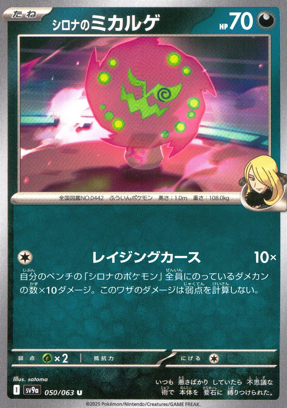 ワザ1:レイジングカース 無 10× 自分のベンチの「シロナのポケモン」全員にのっているダメカンの数×10ダメージ。このワザのダメージは弱点を計算しない。