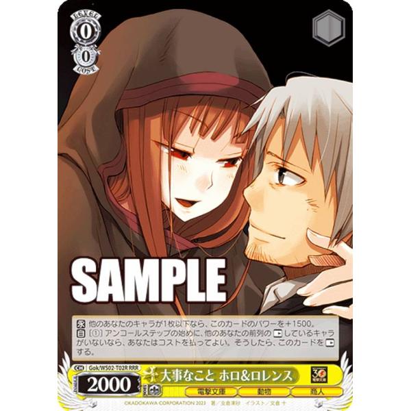 大事なこと ホロ&ロレンス<br>(<br>Gok/WS02-T02R<br>)<br>-[TD]電撃文庫 ヴァイスサイド<br>サイド:<br>種類:キャラ<br>レベル:0<br>色:<br>パワー:2000<br>ソウル:<br>コスト:0<br>レアリティ:RRR<br>トリガー:-<br>特徴:<br>電撃文庫・動物・商人<br>フレーバー:-<br>【永】 他のあなたのキャラが1枚以下なら、このカードのパワーを+1500。<br>【自】[(1)] アンコールステップの始めに、他のあなたの前列の【レスト】しているキャラがいないなら、あなたはコストを払ってよい。そうしたら、このカードを【レスト】する。