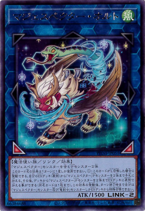 「マジェスペクター」モンスターを含むPモンスター2体このカード名の効果は1ターンに1度しか使用できない。1:このカードがL召喚した場合に発動できる。自分のEXデッキ(表側)から「マジェスペクター」Pモンスターを2体まで手札に加える。その後、デッキから「マジェスペクター」Pモンスターを2体までEXデッキに表側で加える事ができる(同名カードは1枚まで)。この効果の発動後、ターン終了時まで自分は「マジェスペクター」モンスター及び「竜剣士」モンスターしかEXデッキから特殊召喚できない。