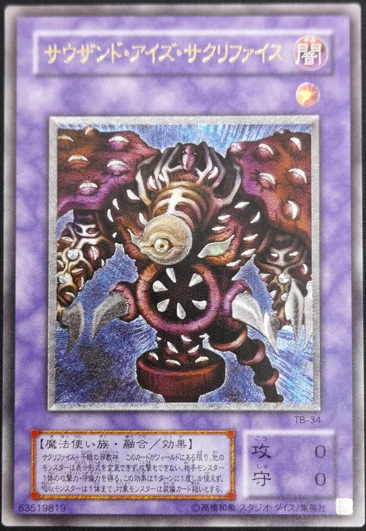 「サクリファイス」+「千眼の邪教神」1:このカードがモンスターゾーンに存在する限り、このカード以外のフィールドのモンスターは攻撃できず、表示形式の変更もできない。2:1ターンに1度、相手フィールドのモンスター1体を対象として発動できる。その相手モンスターを装備カード扱いとしてこのカードに装備する(1体のみ装備可能)。3:このカードの攻撃力・守備力は、このカードの効果で装備したモンスターのそれぞれの数値になり、このカードが戦闘で破壊される場合、代わりに装備したそのモンスターを破壊する。
