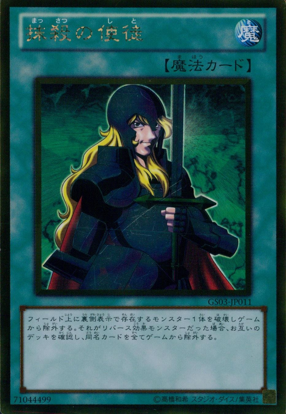 1:フィールドの裏側表示モンスター1体を対象として発動できる。その裏側表示モンスターを破壊し除外する。除外したモンスターがリバースモンスターだった場合、さらにお互いはお互いのデッキを確認し、その中から自分は除外したモンスターの同名モンスターを全て除外する。