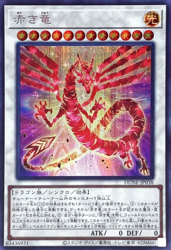 チューナー+チューナー以外のモンスター1体以上このカード名の12の効果はそれぞれ1ターンに1度しか使用できない。1:このカードが特殊召喚した場合に発動できる。デッキから「赤き竜」のカード名が記された魔法・罠カード1枚を手札に加える。2:自分・相手ターンに、「赤き竜」を除く、フィールドのレベル7以上のSモンスター1体を対象として発動できる。このカードをEXデッキに戻し、対象のモンスターと同じレベルのドラゴン族Sモンスター1体をS召喚扱いでEXデッキから特殊召喚する。