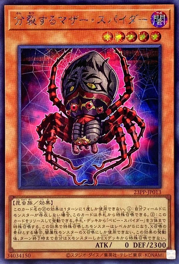 このカード名の2の効果は1ターンに1度しか使用できない。1:自分フィールドにモンスターが存在しない場合、このカードは手札から特殊召喚できる。2:このカードをリリースして発動できる。手札・デッキから「ベビー・スパイダー」を3体まで特殊召喚する。この効果で特殊召喚したモンスターはレベルが5になり、X召喚の素材とする場合、闇属性モンスターのX召喚にしか使用できない。この効果の発動後、ターン終了時まで自分はXモンスターしかEXデッキから特殊召喚できない。