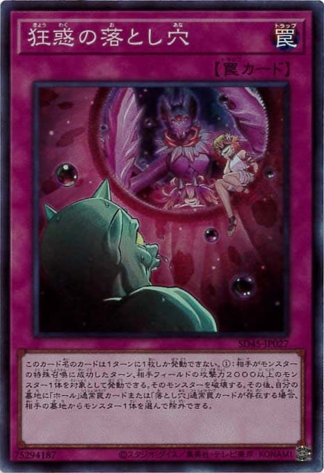 このカード名のカードは1ターンに1枚しか発動できない。1:相手がモンスターを特殊召喚したターン、相手フィールドの攻撃力2000以上のモンスター1体を対象として発動できる。そのモンスターを破壊する。その後、自分の墓地に「ホール」通常罠カードか「落とし穴」通常罠カードが存在する場合、相手の墓地からモンスター1体を除外できる。