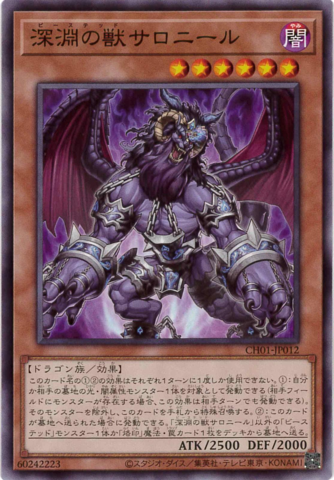 このカード名の12の効果はそれぞれ1ターンに1度しか使用できない。1:自分か相手の墓地の光・闇属性モンスター1体を対象として発動できる(相手フィールドにモンスターが存在する場合、この効果は相手ターンでも発動できる)。そのモンスターを除外し、このカードを手札から特殊召喚する。2:このカードが墓地へ送られた場合に発動できる。「深淵の獣サロニール」以外の「ビーステッド」モンスター1体か「烙印」魔法・罠カード1枚をデッキから墓地へ送る。