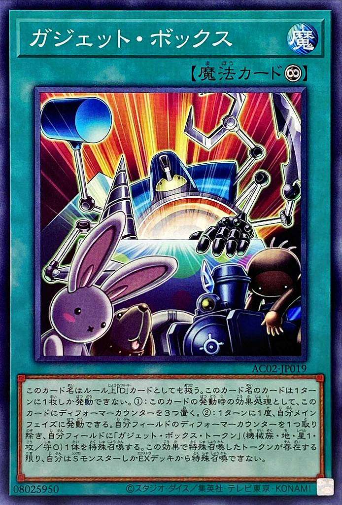 このカード名はルール上「D」カードとしても扱う。このカード名のカードは1ターンに1枚しか発動できない。1:このカードの発動時の効果処理として、このカードにディフォーマーカウンターを3つ置く。2:1ターンに1度、自分メインフェイズに発動できる。自分フィールドのディフォーマーカウンターを1つ取り除き、自分フィールドに「ガジェット・ボックス・トークン」(機械族・地・星1・攻/守0)1体を特殊召喚する。この効果で特殊召喚したトークンが存在する限り、自分はSモンスターしかEXデッキから特殊召喚できない。