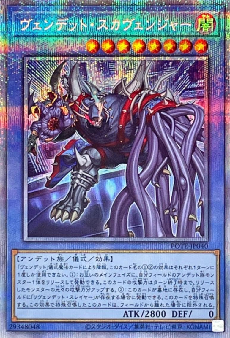 「ヴェンデット」儀式魔法カードにより降臨。このカード名の12の効果はそれぞれ1ターンに1度しか使用できない。1:お互いのメインフェイズに、自分フィールドのアンデット族モンスター1体をリリースして発動できる。このカードの攻撃力はターン終了時まで、リリースしたモンスターの元々の攻撃力分アップする。2:このカードが墓地に存在し、自分フィールドに「リヴェンデット・スレイヤー」が存在する場合に発動できる。このカードを特殊召喚する。この効果で特殊召喚したこのカードは、フィールドから離れた場合に除外される。