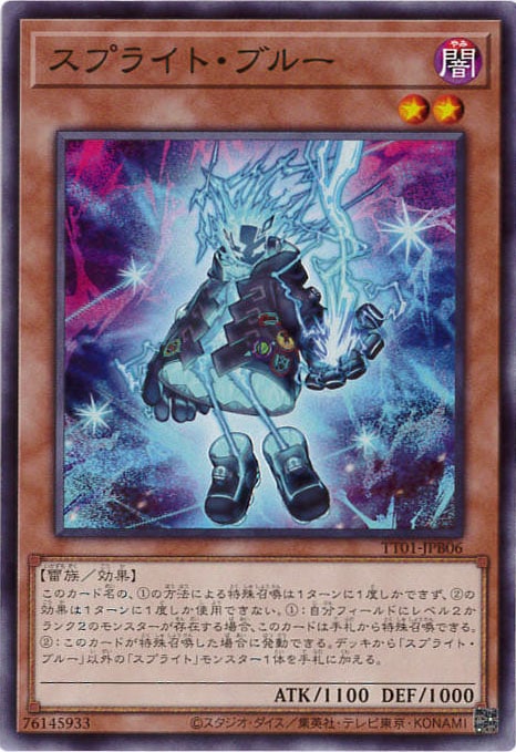 このカード名の、1の方法による特殊召喚は1ターンに1度しかできず、2の効果は1ターンに1度しか使用できない。1:自分フィールドにレベル2かランク2のモンスターが存在する場合、このカードは手札から特殊召喚できる。2:このカードが特殊召喚した場合に発動できる。デッキから「スプライト・ブルー」以外の「スプライト」モンスター1体を手札に加える。