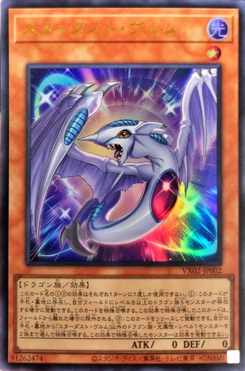 このカード名の12の効果はそれぞれ1ターンに1度しか使用できない。1:このカードが手札・墓地に存在し、自分フィールドにレベル8以上のドラゴン族Sモンスターが存在する場合に発動できる。このカードを特殊召喚する。この効果で特殊召喚したこのカードは、フィールドから離れた場合に除外される。2:このカードをリリースして発動できる。自分の手札・墓地から「スターダスト・ヴルム」以外のドラゴン族・光属性・レベル1モンスターを2体まで選んで特殊召喚する。この効果で特殊召喚したモンスターは効果を発動できない。
