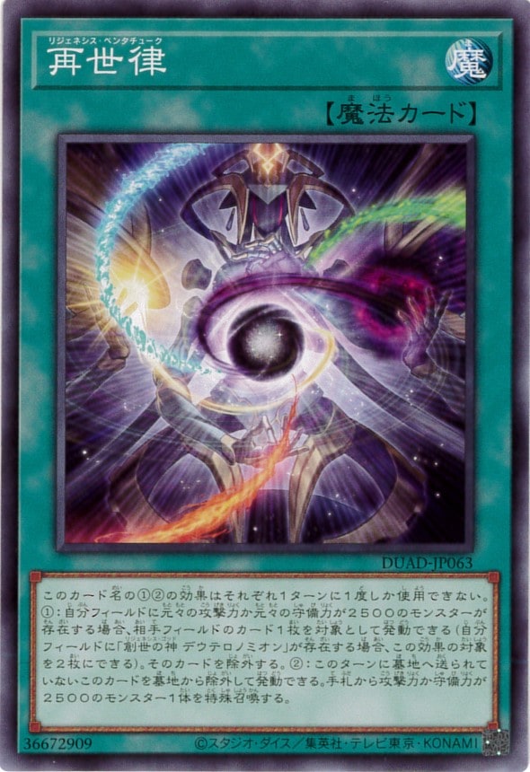 このカード名の12の効果はそれぞれ1ターンに1度しか使用できない。1:自分フィールドに元々の攻撃力か元々の守備力が2500のモンスターが存在する場合、相手フィールドのカード1枚を対象として発動できる(自分フィールドに「創世の神 デウテロノミオン」が存在する場合、この効果の対象を2枚にできる)。そのカードを除外する。2:このターンに墓地へ送られていないこのカードを墓地から除外して発動できる。手札から攻撃力か守備力が2500のモンスター1体を特殊召喚する。