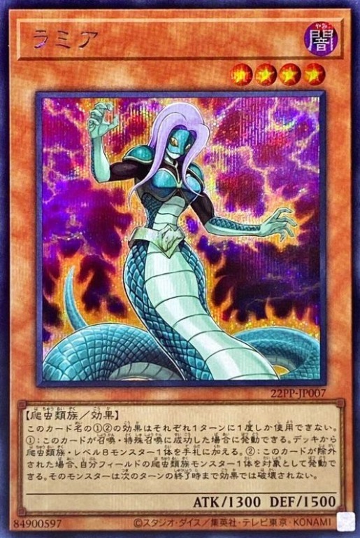 このカード名の12の効果はそれぞれ1ターンに1度しか使用できない。1:このカードが召喚・特殊召喚した場合に発動できる。デッキから爬虫類族・レベル8モンスター1体を手札に加える。2:このカードが除外された場合、自分フィールドの爬虫類族モンスター1体を対象として発動できる。そのモンスターは次のターンの終了時まで効果では破壊されない。