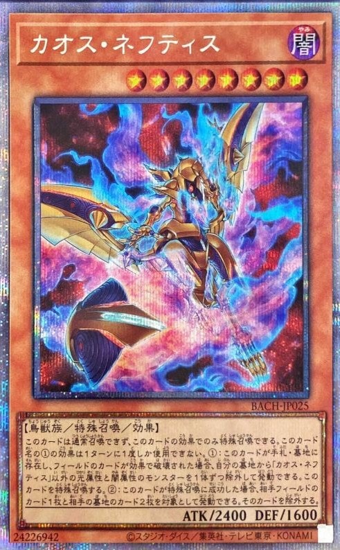 このカードは通常召喚できず、このカードの効果でのみ特殊召喚できる。このカード名の1の効果は1ターンに1度しか使用できない。1:このカードが手札・墓地に存在し、フィールドのカードが効果で破壊された場合、自分の墓地から「カオス・ネフティス」以外の光属性と闇属性のモンスターを1体ずつ除外して発動できる。このカードを特殊召喚する。2:このカードが特殊召喚に成功した場合、相手フィールドのカード1枚と相手の墓地のカード2枚を対象として発動できる。そのカードを除外する。