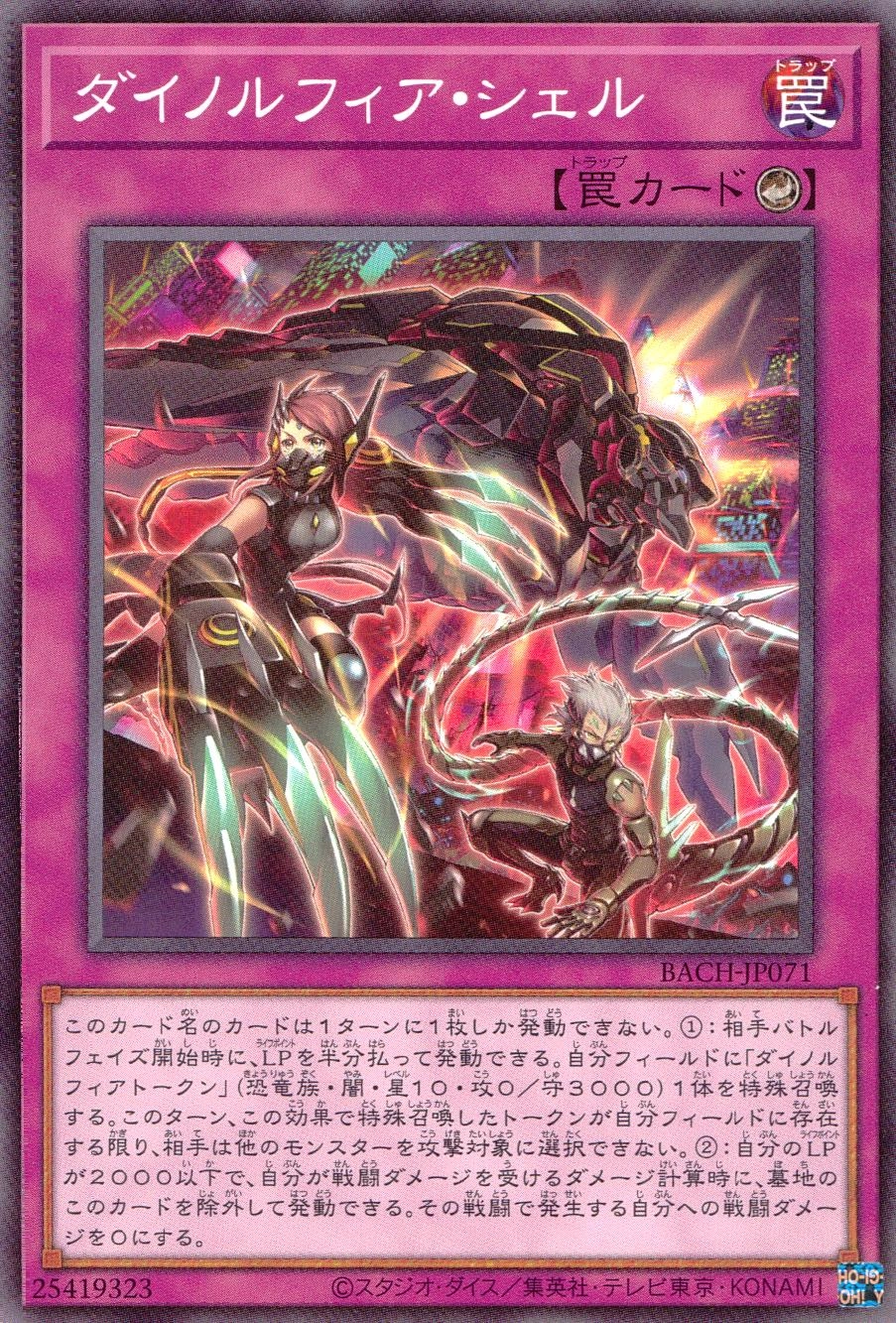 このカード名のカードは1ターンに1枚しか発動できない。1:相手バトルフェイズ開始時に、LPを半分払って発動できる。自分フィールドに「ダイノルフィアトークン」(恐竜族・闇・星10・攻0/守3000)1体を特殊召喚する。このターン、この効果で特殊召喚したトークンが自分フィールドに存在する限り、相手は他のモンスターを攻撃対象に選択できない。2:自分のLPが2000以下で、自分が戦闘ダメージを受けるダメージ計算時に、墓地のこのカードを除外して発動できる。その戦闘で発生する自分への戦闘ダメージを0にする。
