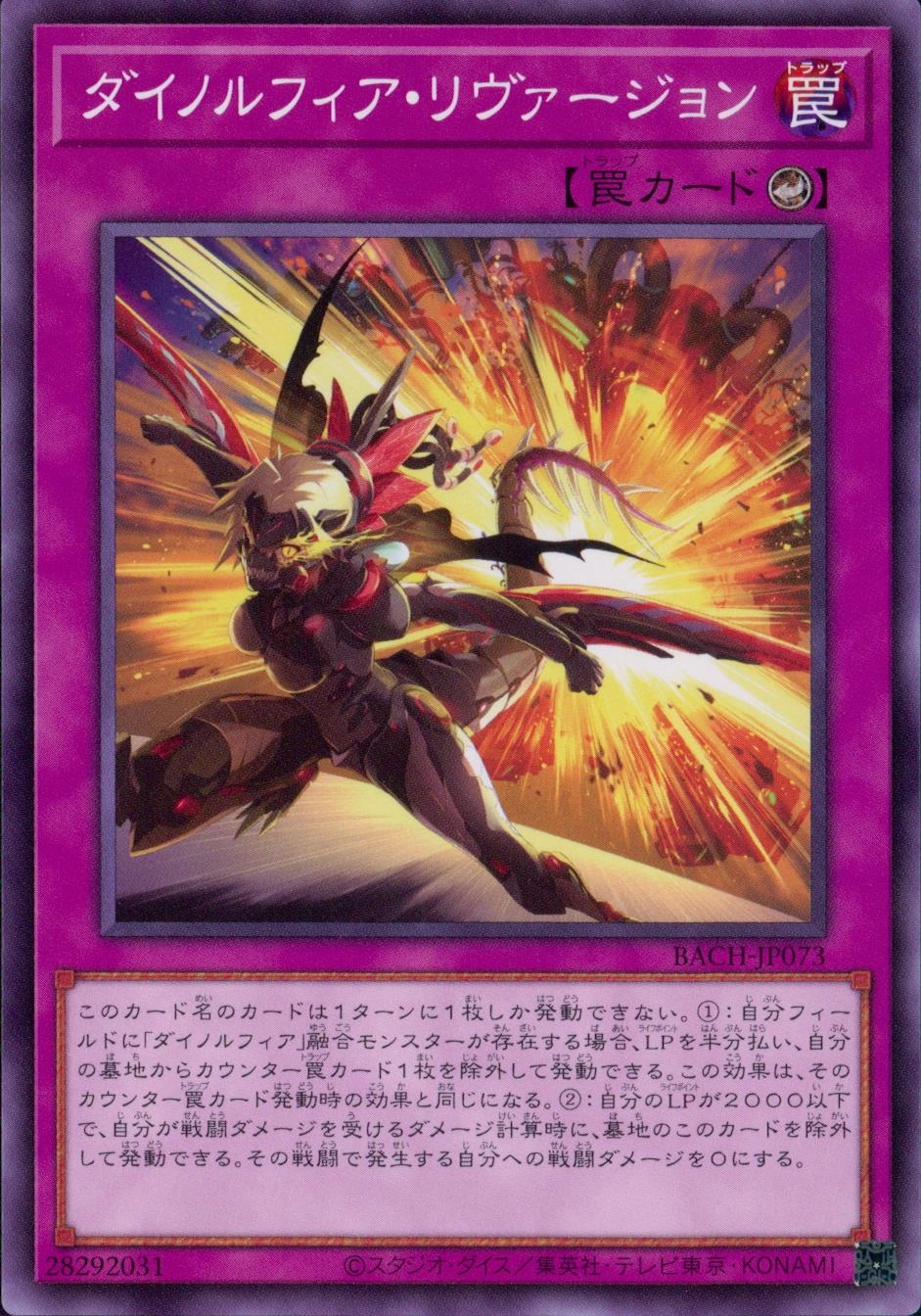 このカード名のカードは1ターンに1枚しか発動できない。1:自分フィールドに「ダイノルフィア」融合モンスターが存在する場合、LPを半分払い、自分の墓地からカウンター罠カード1枚を除外して発動できる。この効果は、そのカウンター罠カード発動時の効果と同じになる。2:自分のLPが2000以下で、自分が戦闘ダメージを受けるダメージ計算時に、墓地のこのカードを除外して発動できる。その戦闘で発生する自分への戦闘ダメージを0にする。