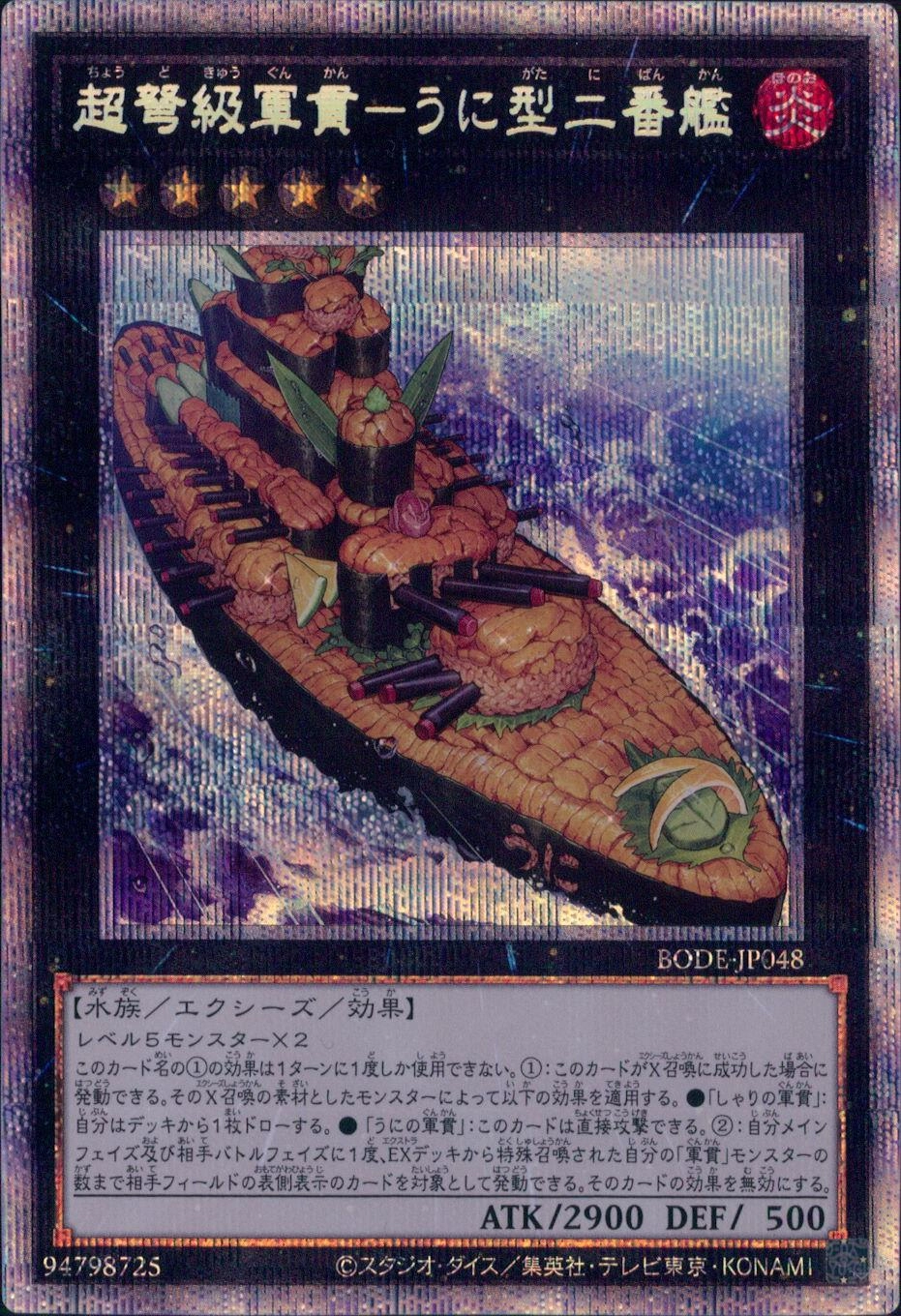 レベル5モンスター×2このカード名の1の効果は1ターンに1度しか使用できない。1:このカードがX召喚に成功した場合に発動できる。そのX召喚の素材としたモンスターによって以下の効果を適用する。●「しゃりの軍貫」:自分はデッキから1枚ドローする。●「うにの軍貫」:このカードは直接攻撃できる。2:自分メインフェイズ及び相手バトルフェイズに1度、EXデッキから特殊召喚された自分の「軍貫」モンスターの数まで相手フィールドの表側表示のカードを対象として発動できる。そのカードの効果を無効にする。