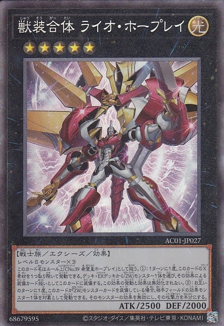 レベル5モンスター×3このカード名はルール上「CNo.39 希望皇ホープレイ」として扱う。1:1ターンに1度、このカードのX素材を1つ取り除いて発動できる(この効果の発動と効果は無効化されない)。デッキ・EXデッキから「ZW」モンスター1体を選び、その効果による装備魔法カード扱いでこのカードに装備する。2:お互いのターンに1度、このカードが「ZW」モンスターカードを装備している場合、相手フィールドの効果モンスター1体を対象として発動できる。そのモンスターの効果を無効にし、その攻撃力を半分にする。