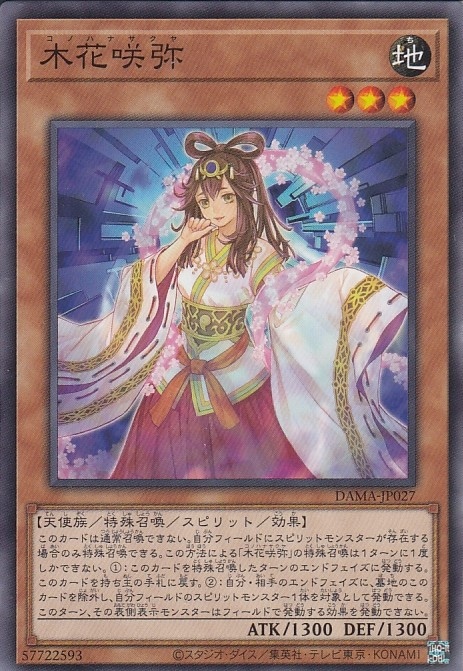 このカードは通常召喚できない。自分フィールドにスピリットモンスターが存在する場合のみ特殊召喚できる。この方法による「木花咲弥」の特殊召喚は1ターンに1度しかできない。1:このカードを特殊召喚したターンのエンドフェイズに発動する。このカードを持ち主の手札に戻す。2:自分・相手のエンドフェイズに、墓地のこのカードを除外し、自分フィールドのスピリットモンスター1体を対象として発動できる。このターン、その表側表示モンスターはフィールドで発動する効果を発動できない。