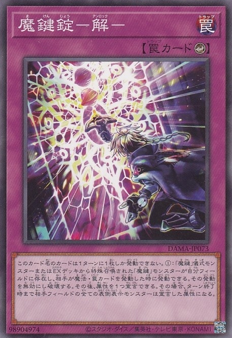 このカード名のカードは1ターンに1枚しか発動できない。1:「魔鍵」儀式モンスターまたはEXデッキから特殊召喚された「魔鍵」モンスターが自分フィールドに存在し、相手が魔法・罠カードを発動した時に発動できる。その発動を無効にし破壊する。その後、属性を1つ宣言できる。その場合、ターン終了時まで相手フィールドの全ての表側表示モンスターは宣言した属性になる。