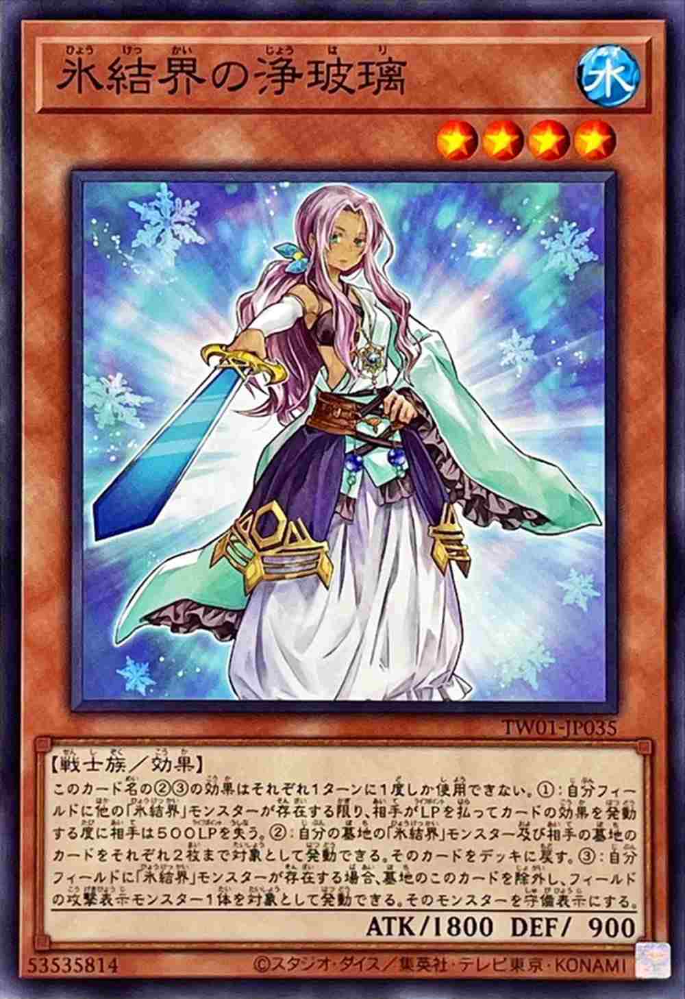 水属性 レベル 4 【戦士族/効果】 攻撃力 1800 守備力 900 このカード名の23の効果はそれぞれ1ターンに1度しか使用できない。1:自分フィールドに他の「氷結界」モンスターが存在する限り、相手がLPを払ってカードの効果を発動する度に相手は500LPを失う。2:自分の墓地の「氷結界」モンスター及び相手の墓地のカードをそれぞれ2枚まで対象として発動できる。そのカードをデッキに戻す。3:自分フィールドに「氷結界」モンスターが存在する場合、墓地のこのカードを除外し、フィールドの攻撃表示モンスター1体を対象として発動できる。そのモンスターを守備表示にする。