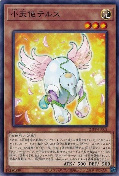 このカード名の12の効果はそれぞれ1ターンに1度しか使用できない。1:このカードがモンスターゾーンから墓地へ送られた場合に発動できる。自分フィールドに「テルスの羽トークン」(天使族・光・星1・攻/守0)1体を特殊召喚する。2:自分フィールドに「テルスの羽トークン」が存在する場合、墓地のこのカードと手札の魔法カード1枚を除外して発動できる。自分フィールドに「テルスの羽トークン」2体を特殊召喚する。この効果の発動後、ターン終了時まで自分は手札からしかモンスターを特殊召喚できない。