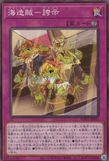 このカード名の12の効果はそれぞれ1ターンに1度しか使用できない。1:自分の「海造賊」モンスターが戦闘で相手モンスターを破壊した場合に発動する。自分はデッキから1枚ドローする。2:自分フィールドに「海造賊」モンスターが存在する場合、魔法&罠ゾーンの表側表示のこのカードを墓地へ送り、以下の効果から1つを選択して発動できる。●相手はデッキから1枚ドローする。その後、自分は相手の手札を確認し、その内のモンスター1体を選んで墓地へ送る。●相手のEXデッキを確認し、その内の1枚を選んで墓地へ送る。