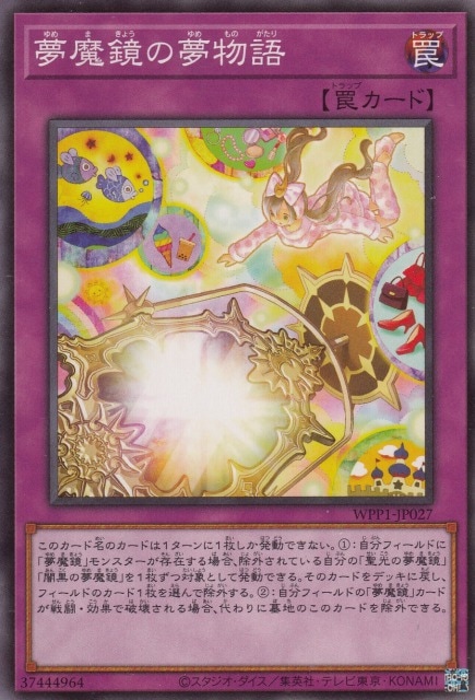 このカード名のカードは1ターンに1枚しか発動できない。1:自分フィールドに「夢魔鏡」モンスターが存在する場合、除外されている自分の「聖光の夢魔鏡」「闇黒の夢魔鏡」を1枚ずつ対象として発動できる。そのカードをデッキに戻し、フィールドのカード1枚を選んで除外する。2:自分フィールドの「夢魔鏡」カードが戦闘・効果で破壊される場合、代わりに墓地のこのカードを除外できる。